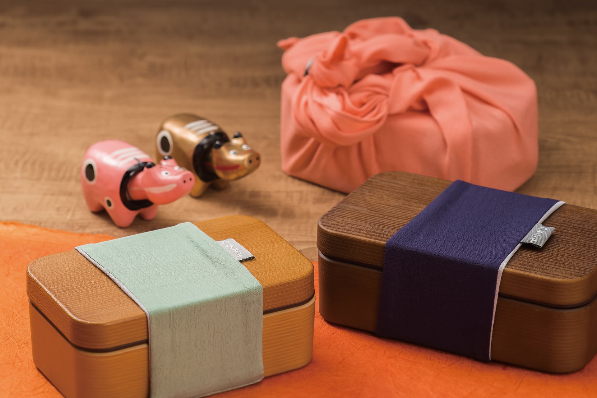 シンプルな木目調の1段弁当箱に極太のランチバンドをプラス。まるでハラマキを巻いたような親しみやすさを持っています。