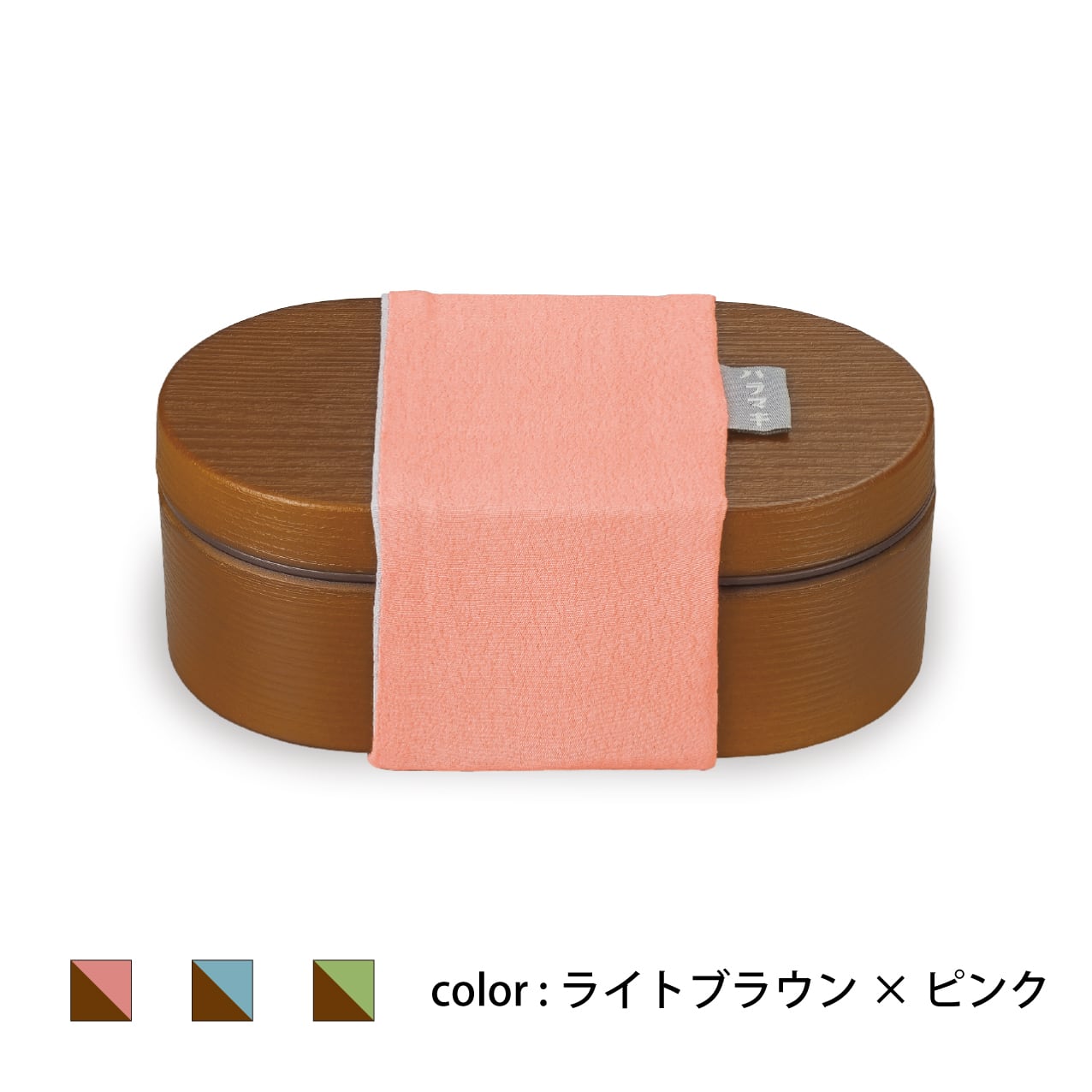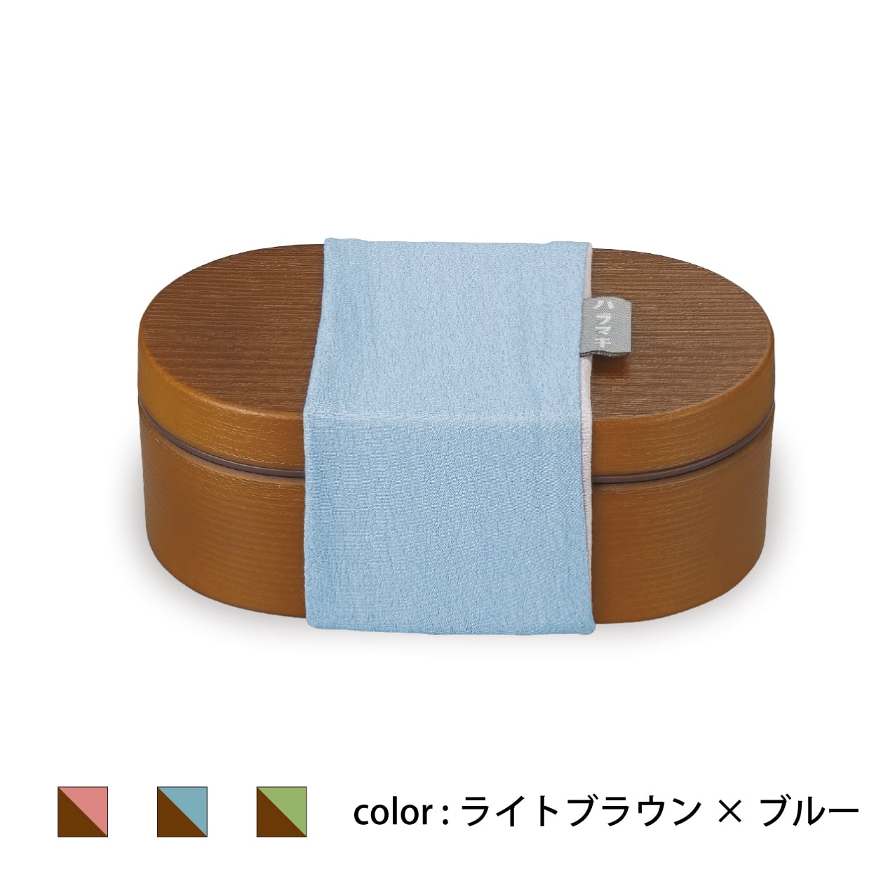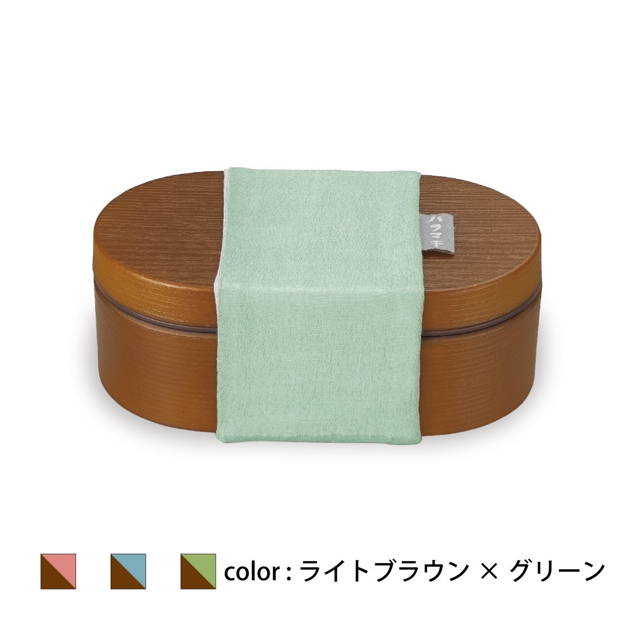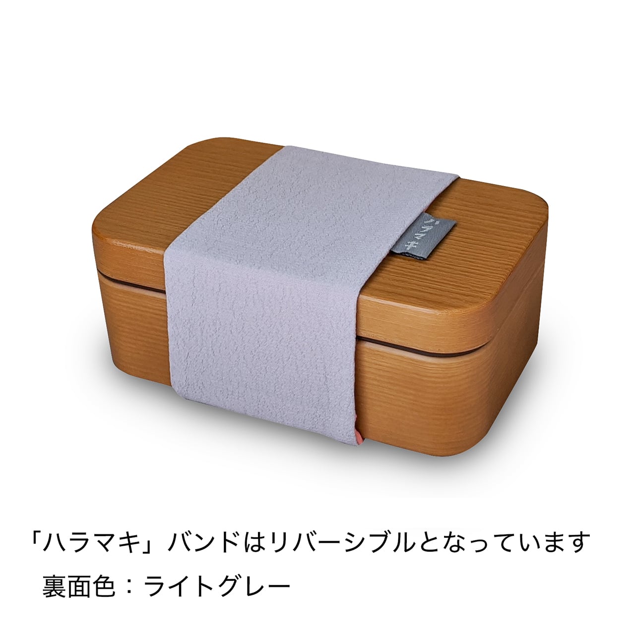 シンプルな木目調の1段弁当箱に極太のランチバンドをプラス。まるでハラマキを巻いたような親しみやすさを持っています。